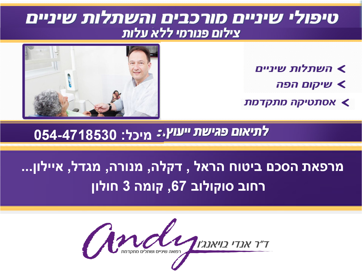 ריכוז של תשתיות ויכולות רפואיות שהם מעבר לרגיל, מאפשרים מחד טיפול רפואי ברמה הגבוהה ביותר, מאידך רמת מחירים אטרקטיבית מאוד. הסיסמא של ד"ר אנדי בויאנג'ו – "רפואת שיניים איכותית לא לעשירים בלבד", היא באמת בדוקה ומוכחת. למעוניינים בפרטים נוספים ולתאום פגישת ייעוץ ובדיקה הכוללת צילום פנורמי ללא תשלום.